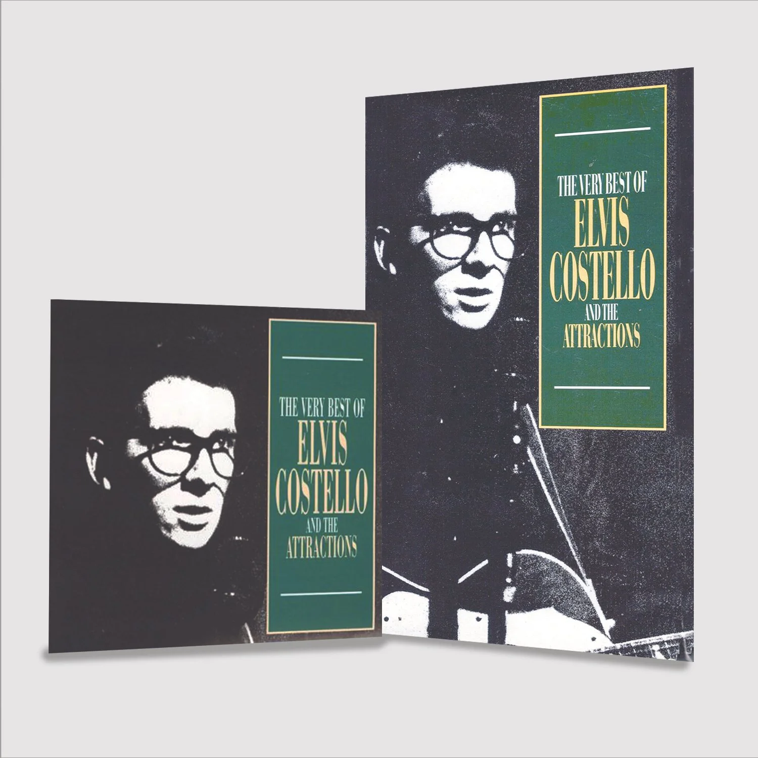 I went straight to work and got something for Don to send and, with perhaps a couple of minor changes, it was approved by their timeline! Wow. So here is the cover I designed for “The Very Best of Elvis Costello and The Attractions,” along with a copy of the longbox for the CD bins, which due to size, featured a different (better?) crop.